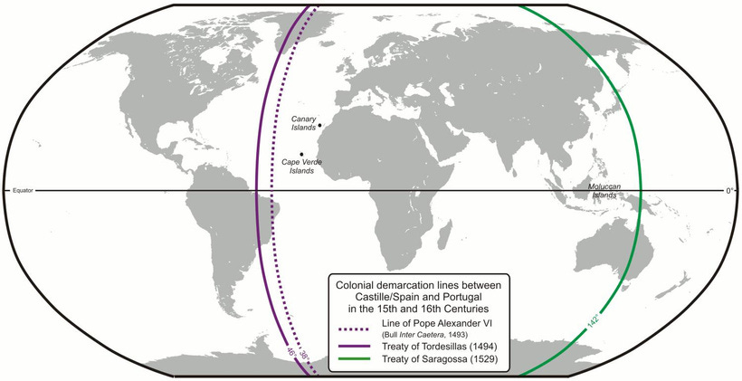 西班牙/葡萄牙帝國競爭海外殖民地之時,教科書上一定會提到一個事件:「簽訂托德西亞斯條約」(Treaty of Tordesillas),雙方劃定彼此的勢力範圍,以維德角以西2100公里為界,以西歸西班牙,以東歸葡萄牙。